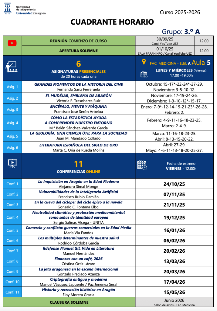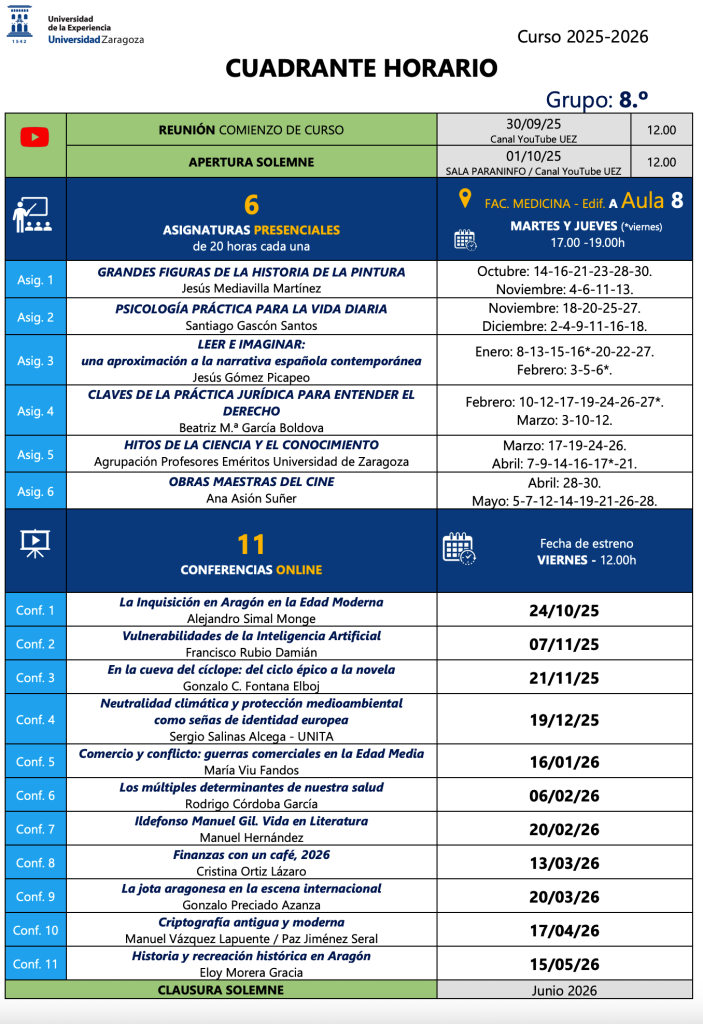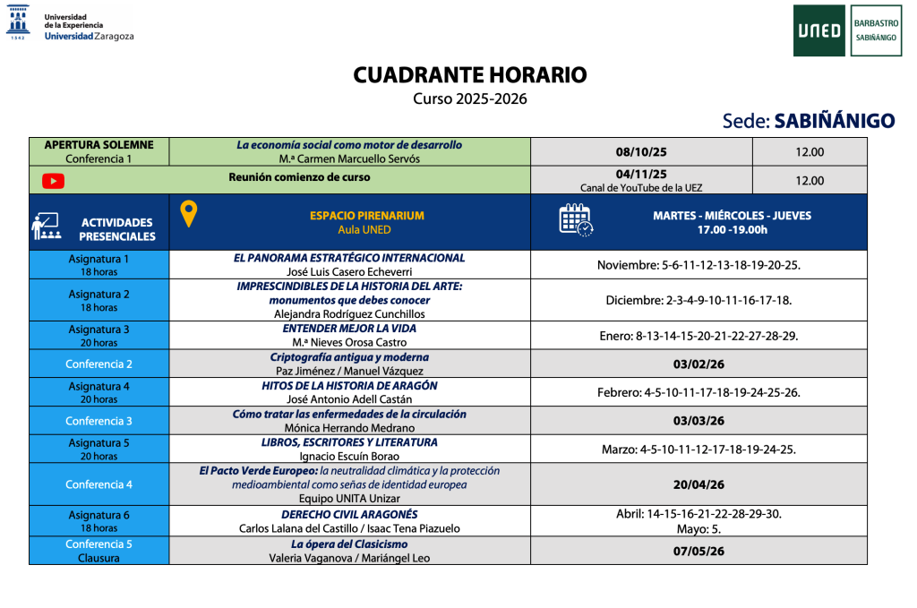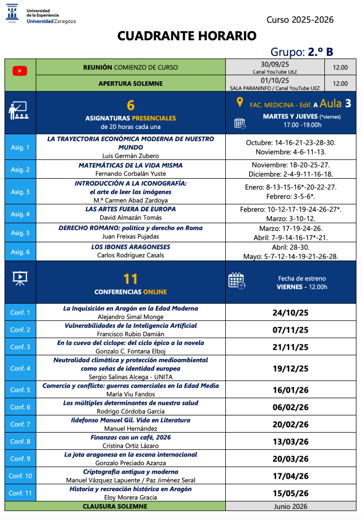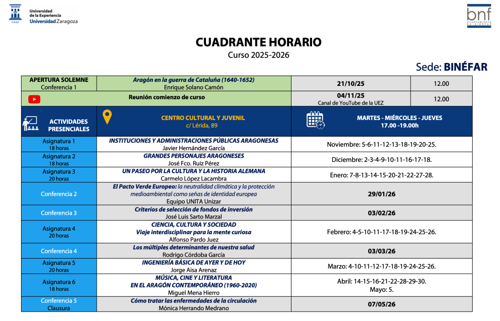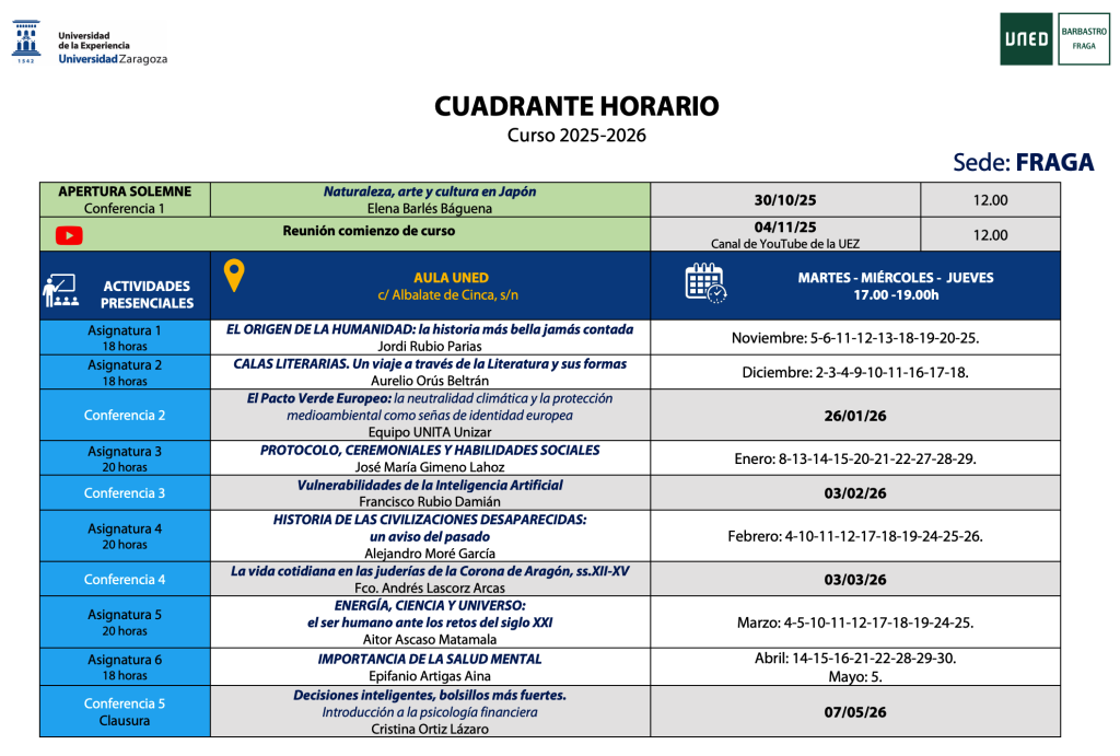 HORARIOS CURSO 2025-2026 Última modificación Jue , 08/01/2026 - 06:08 PROGRAMA BÁSICO ZARAGOZA CURSO 1ºA CURSO 1ºB CURSO 2ºA CURSO 2ºB CURSO 3ºA CURSO 3ºB CURSO 4ºA CURSO 4ºB CURSO 5º CURSO 6º CURSO 7º CURSO 8º PROGRAMA BÁSICO SEDES ALAGÓN ALCAÑIZ LA PUEBLA DE ALFINDÉN BARBASTRO BINÉFAR BORJA CALATAYUD CASPE EJEA DE LOS CABALLEROS ÉPILA FRAGA JACA HUESCA GRUPO 1 HUESCA GRUPO 2 MONZÓN SABIÑÁNIGO TARAZONA TAUSTE TERUEL UTEBO